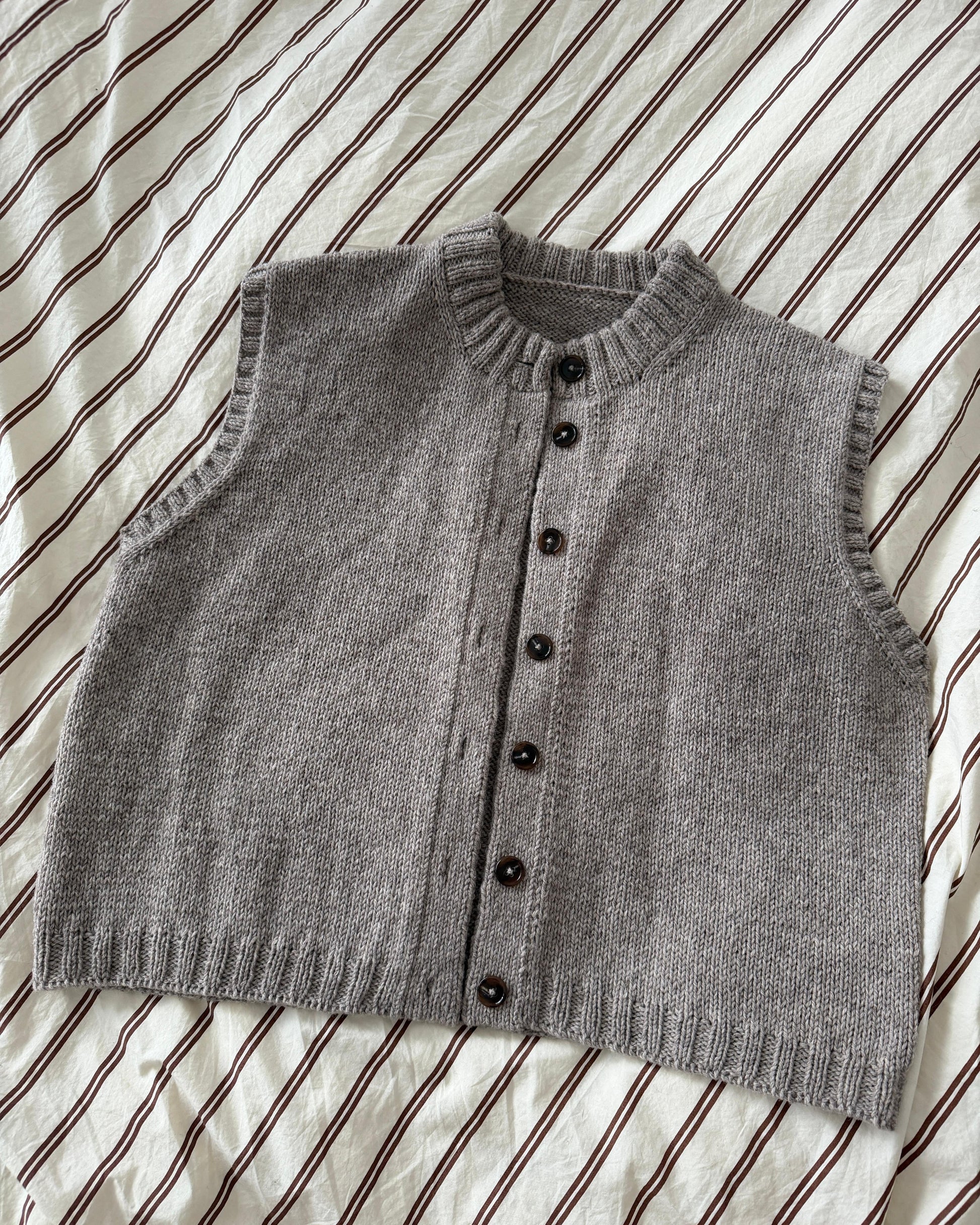 Hanni vest is an oversized, boxy and cozy vest featuring an O-neckline and folded 2 x 2 ribbed collar. The vest is knitted from the top down. The back is shaped with short rows before adding the shoulders separately. Armholes are shaped with increases and finished with 2 x 2 ribbing. The vest is worked flat in stockinette stitch. The button plackets are worked in double knitting with buttonholes along the right side.